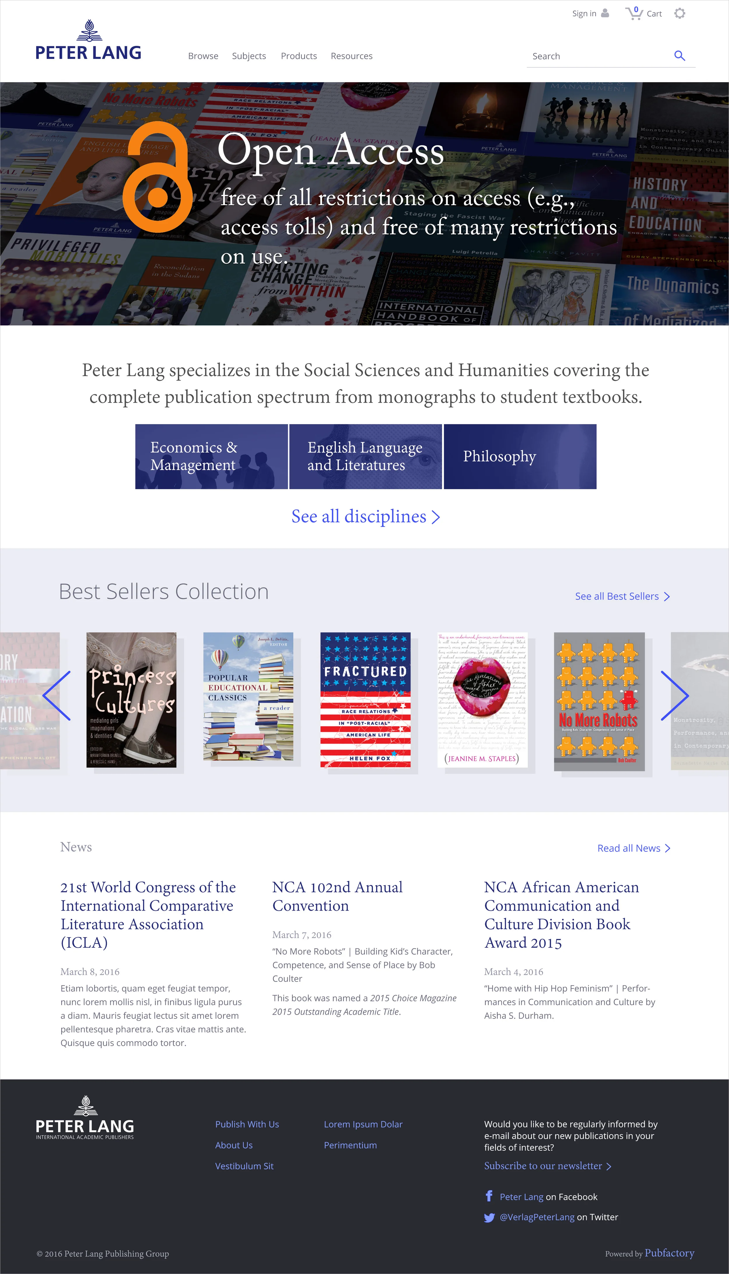 The team at PubFactory brought me into this project to customize the homepage and a number of global elements like the masthead and footer, for Peter Lang Publishing Group. Pubfactory is a CMS that often requires their out-of-the-box platform to be redesigned to conform to the brand requirements of their clients', making the end-product feel more distinctly the “client's own”.