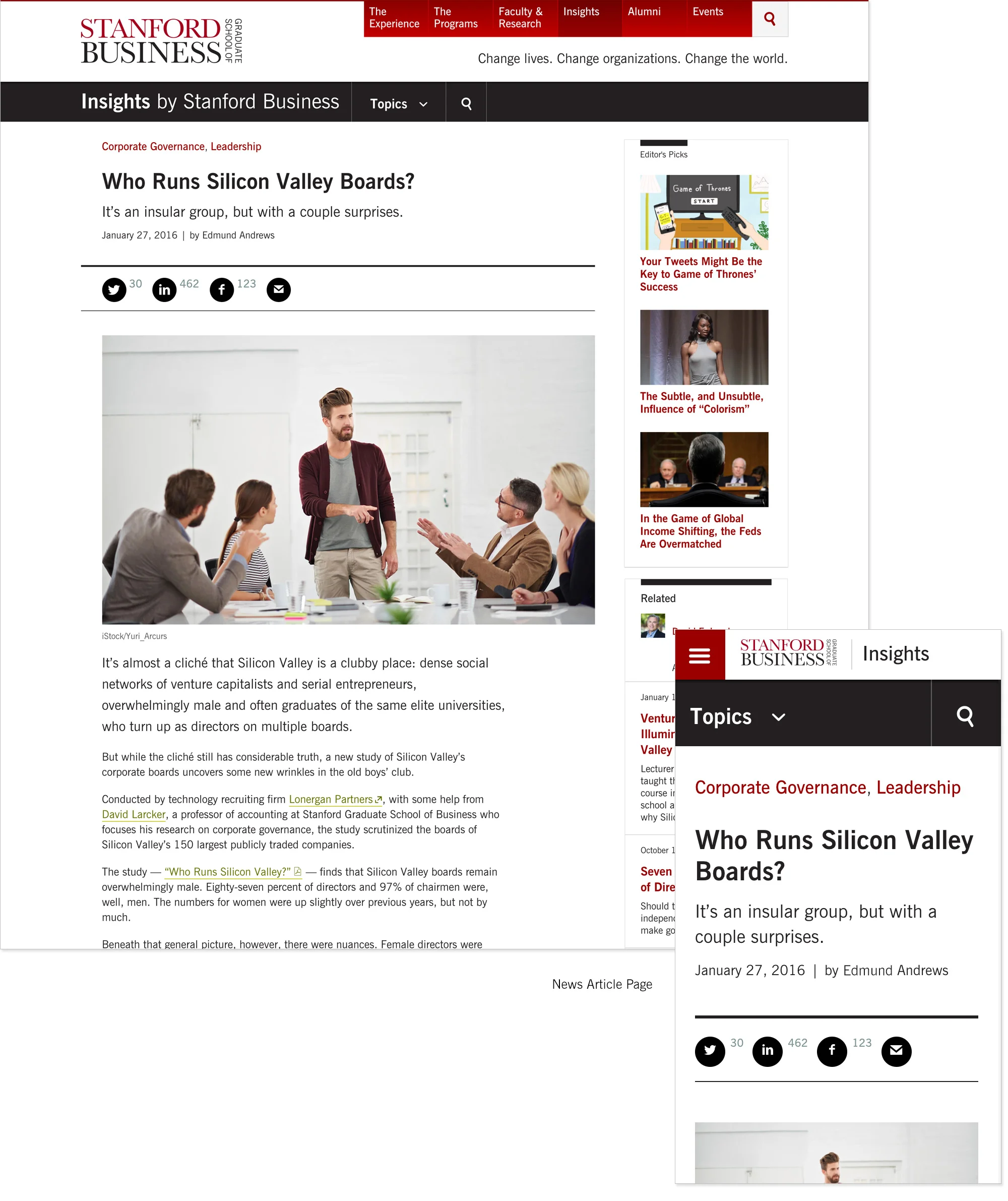 Another digital magazine, Business Insights—which in 2015 was nominated for a Webby Award. After having custom-designed nearly all other major sections of this site, the team asked that I continue with the look & feel I had established, but to also give this section a touch of it’s own identity apart from the rest of the site. I thought to achieve this by designing layouts that could be entirely this section's own, leaving me free to design the elements within, without degrading the tight visual identity of our design system throughout the rest of the site.