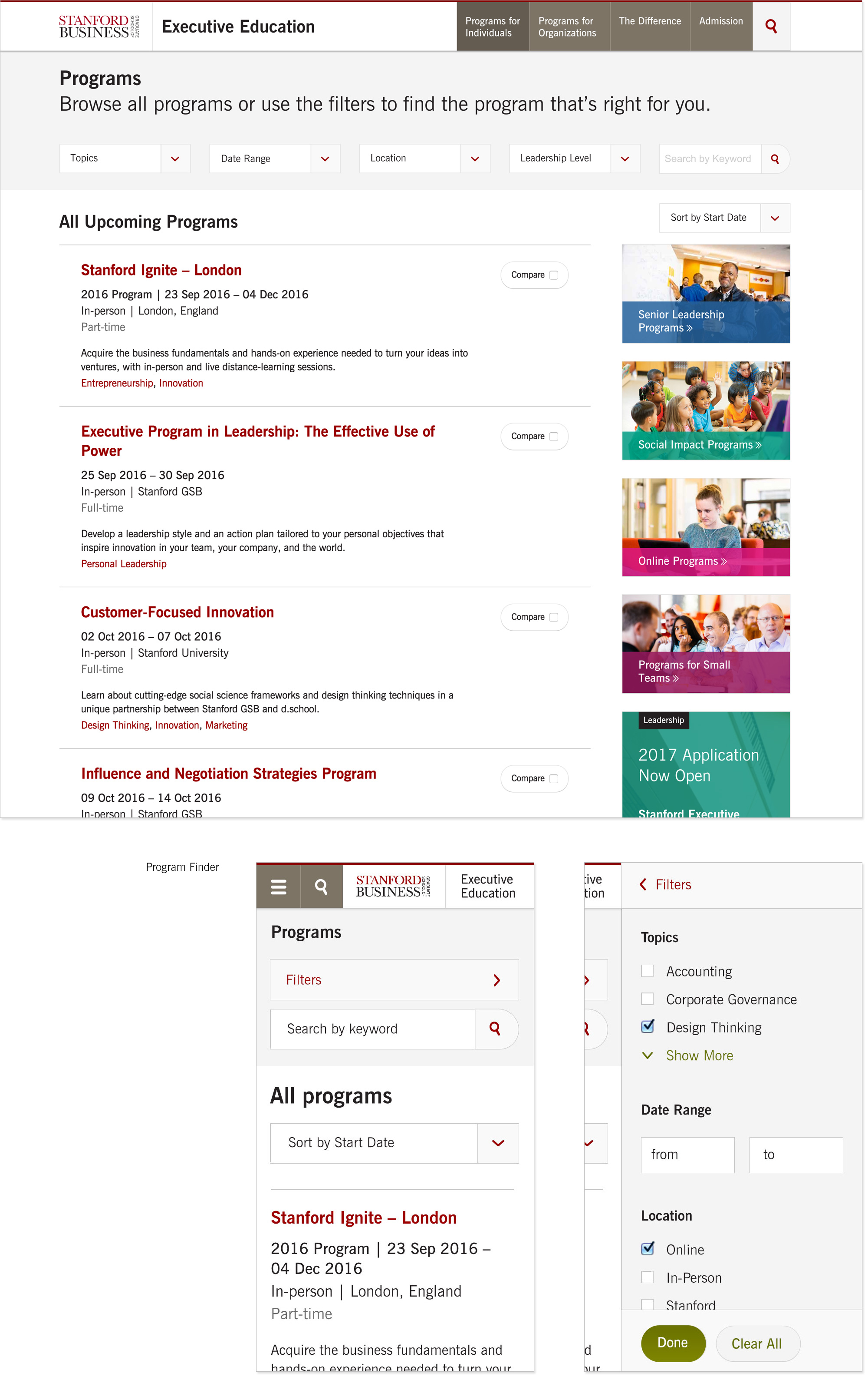 Create an interface that makes it easy to find programs with a user who might have a two-week window, during a specific month out of the year, inside a certain vertical, with a particular level of expertise and a requirement to get the course approved by their boss. This was designing the Program Finder. I don’t often work in wireframes, unless my team or client have very little idea of their content requirements, and even then, I may only roughly sketch content ideas before going into visual design and look and feel. There are too many aspects of visual design that can tilt the way our eyes perceive visual information. Seventy+ comps paid off for our team on the program finder, which let us test our constraints around adhering to the larger design system from gsb.stanford.edu, brand identity, and most importantly, intuitive usability.